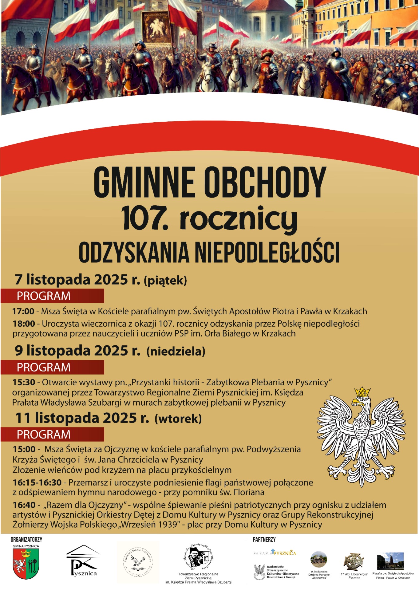 🕒 15:00 – Msza Święta za Ojczyznę w kościele parafialnym pw. Podwyższenia Krzyża Świętego i św. Jana Chrzciciela w Pysznicy