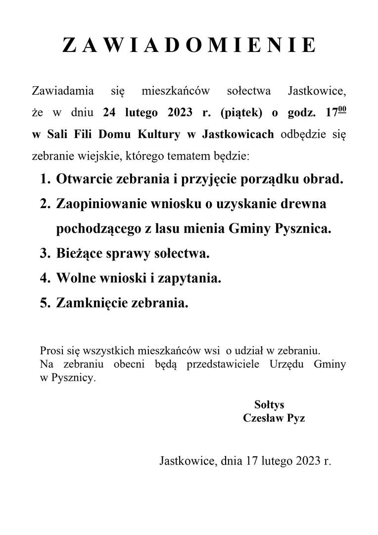 Zapraszamy na zebranie wiejskie w Jastkowicach
